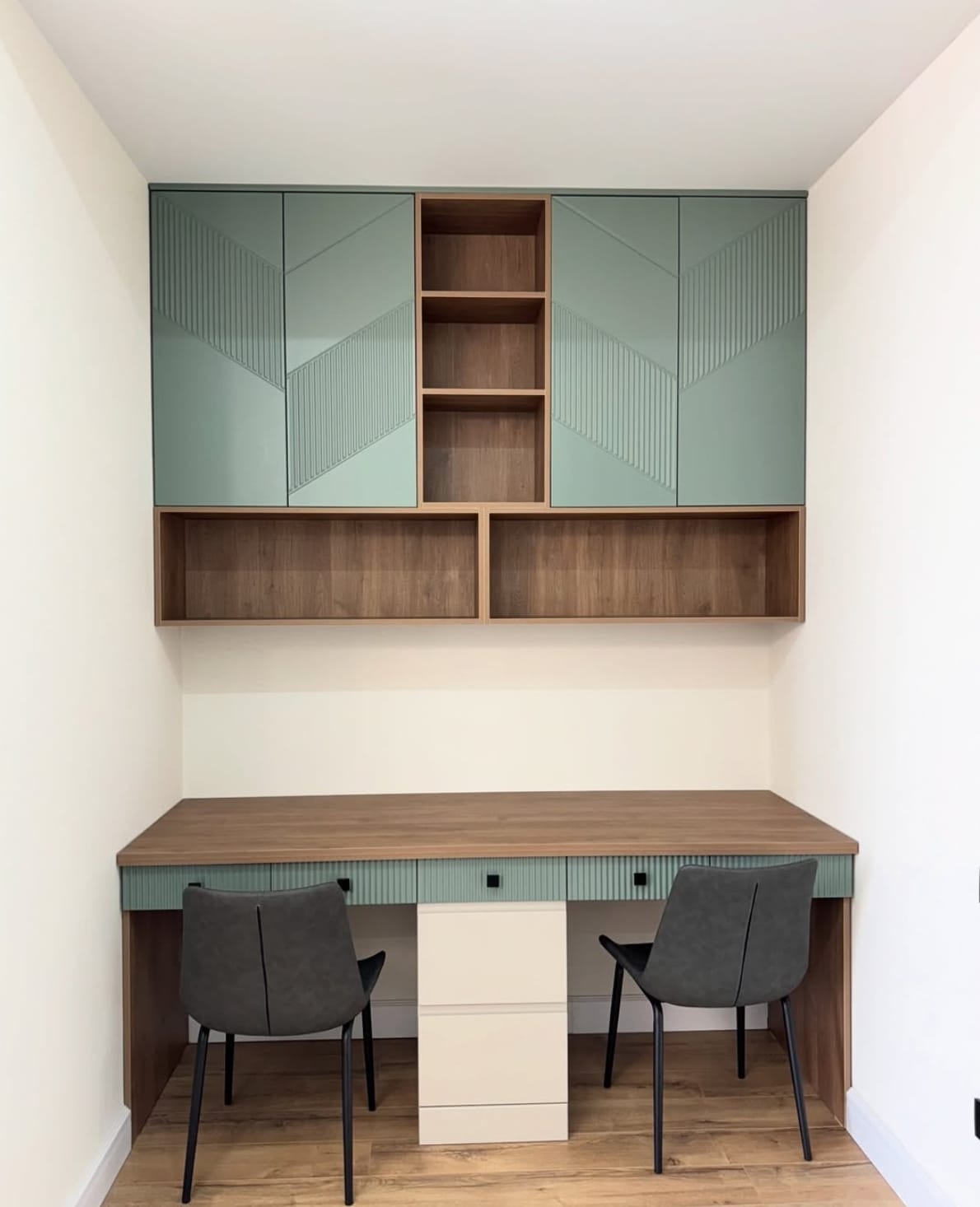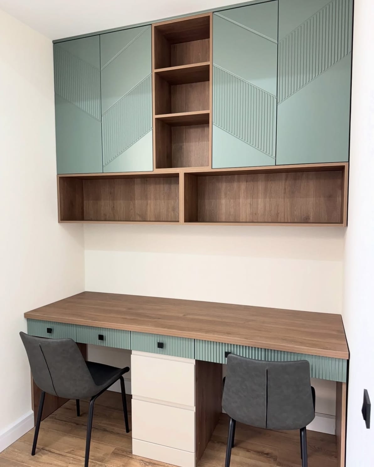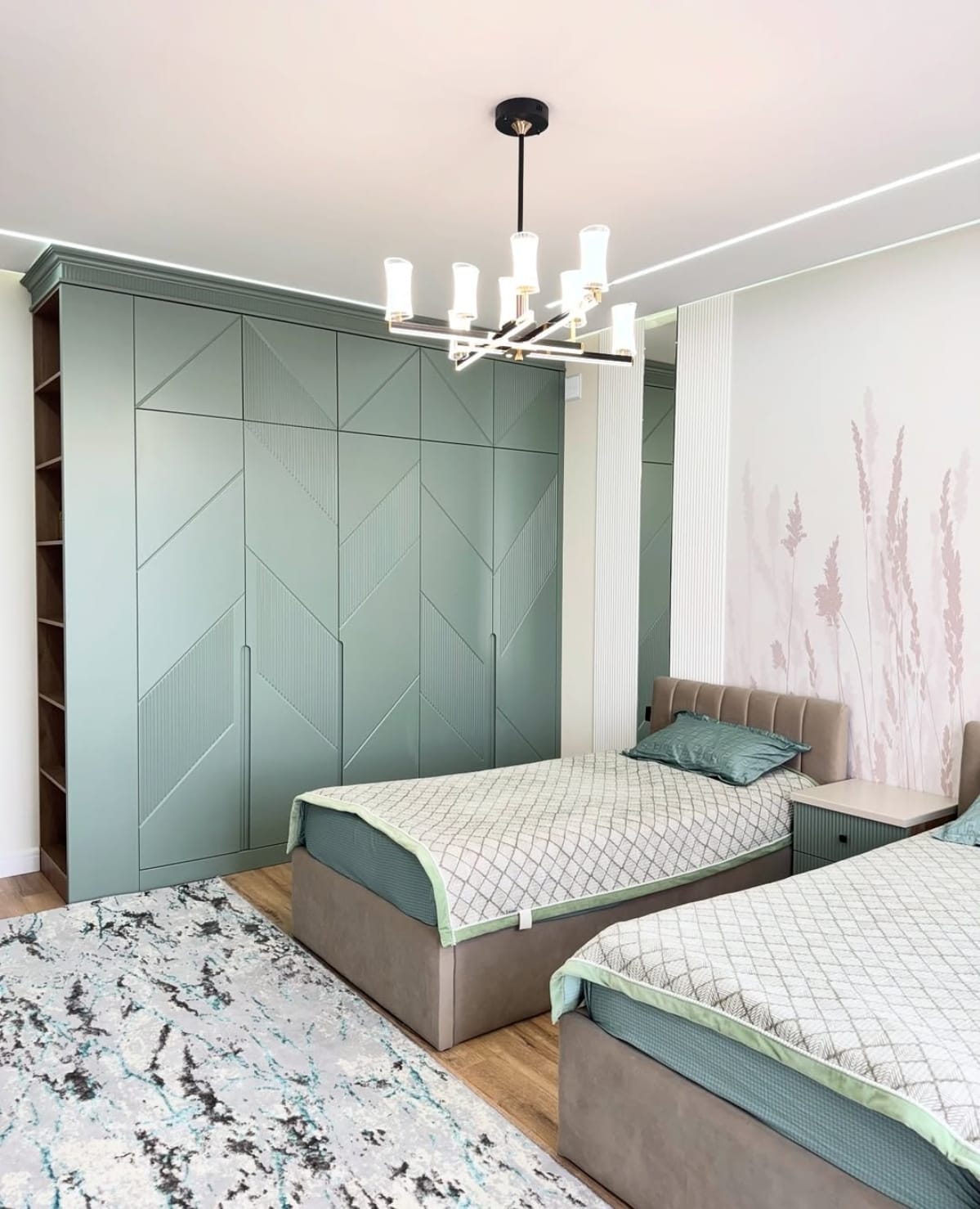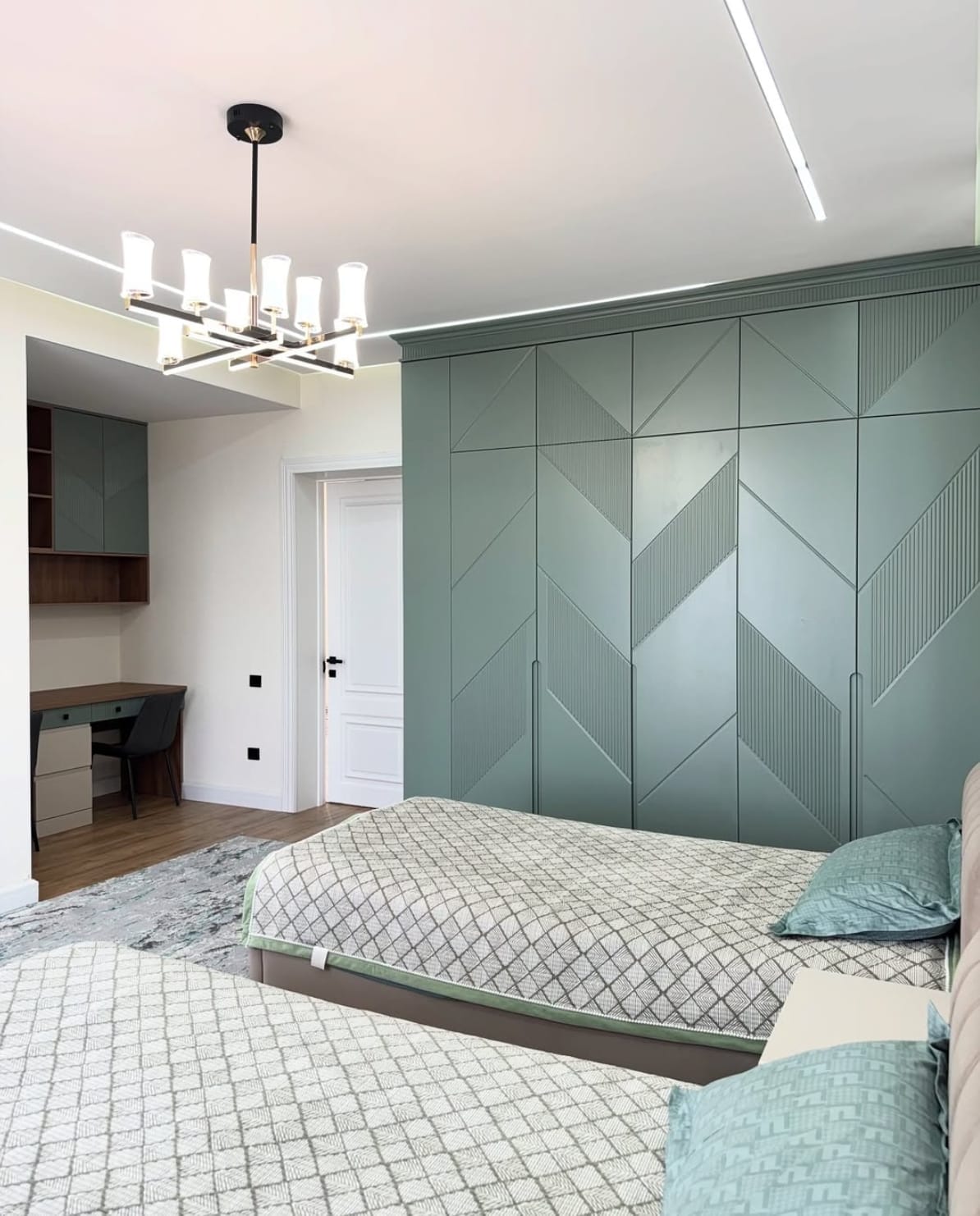 საძინებელი დამზადებულია შეღებილი MDF მასალისგან, რაც ქმნის სუფთა ხაზებსა და ელეგანტურ ვიზუალს.ინტერიერში განსაკუთრებულ ყურადღებას იქცევს დიდი კარადა გეომეტრიული დიზაინის კარებით, რომელიც არა მხოლოდ ვიზუალურად გამორჩეულია, არამედ უზრუნველყოფს ფართო საცავ სივრცეს. დამატებით, ოთახში ინტეგრირებულია სამეცადინო კუთხე, რაც განსაკუთრებით კომფორტულია ყოველდღიური გამოყენებისთვის.