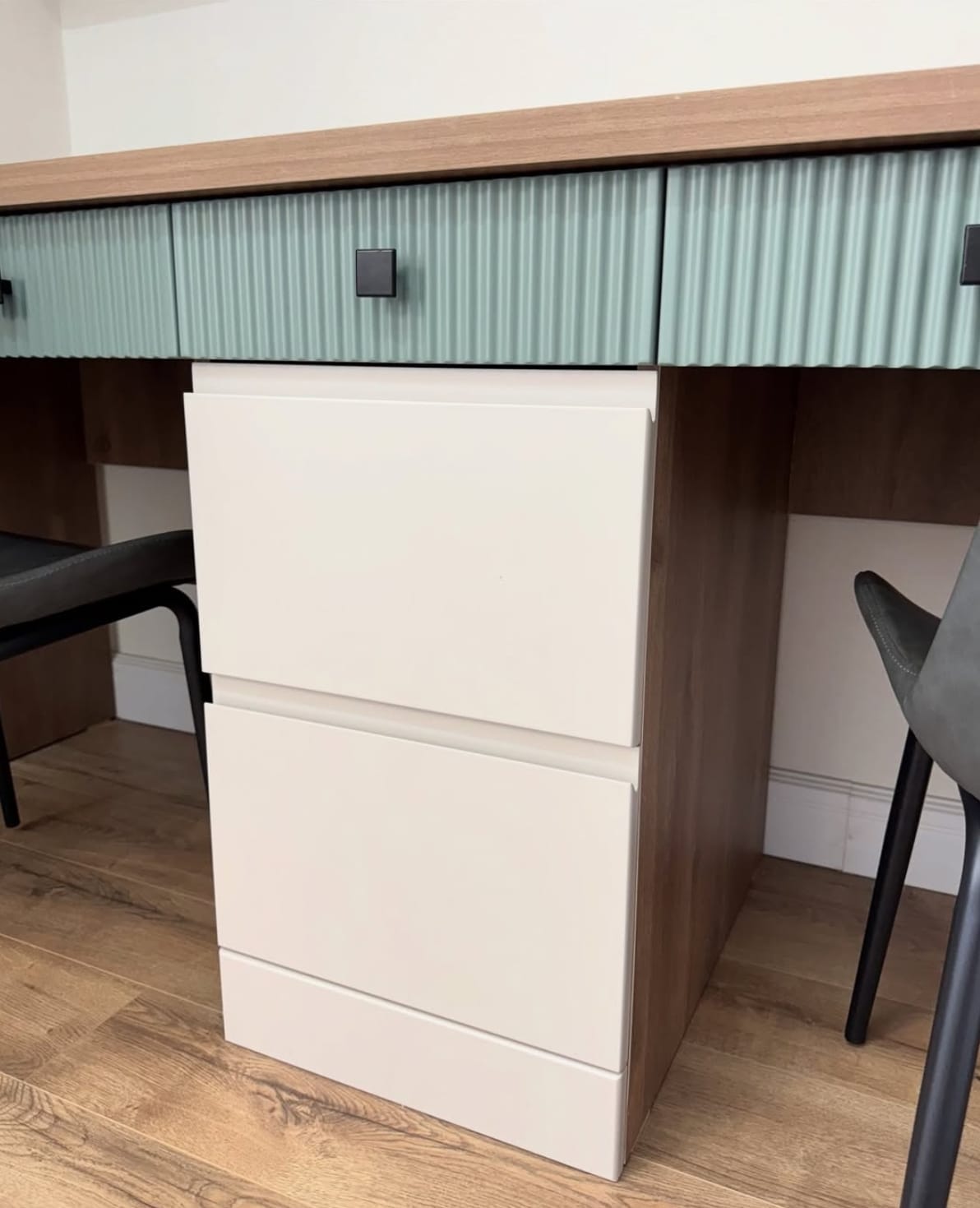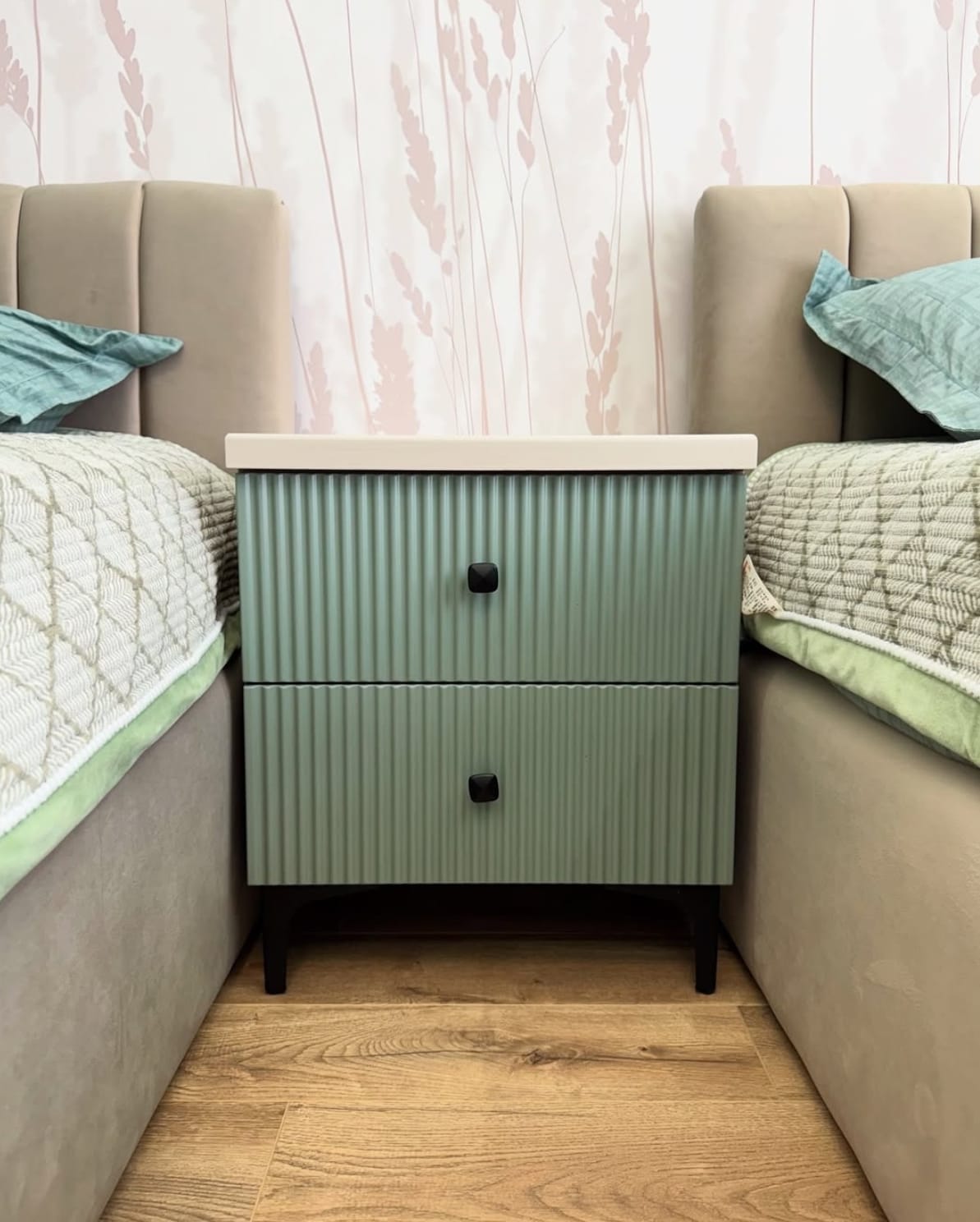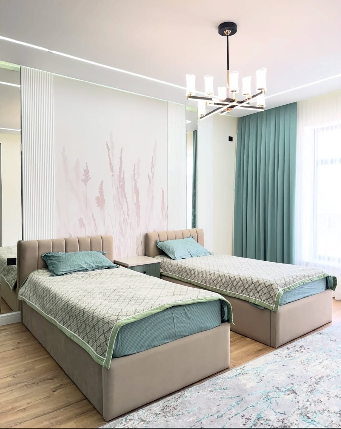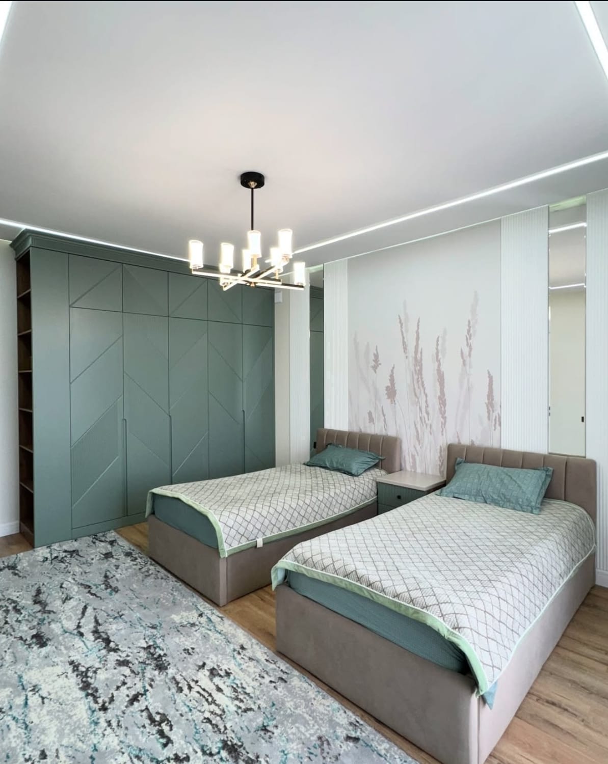 საძინებელი დამზადებულია შეღებილი MDF მასალისგან, რაც ქმნის სუფთა ხაზებსა და ელეგანტურ ვიზუალს.ინტერიერში განსაკუთრებულ ყურადღებას იქცევს დიდი კარადა გეომეტრიული დიზაინის კარებით, რომელიც არა მხოლოდ ვიზუალურად გამორჩეულია, არამედ უზრუნველყოფს ფართო საცავ სივრცეს. დამატებით, ოთახში ინტეგრირებულია სამეცადინო კუთხე, რაც განსაკუთრებით კომფორტულია ყოველდღიური გამოყენებისთვის.