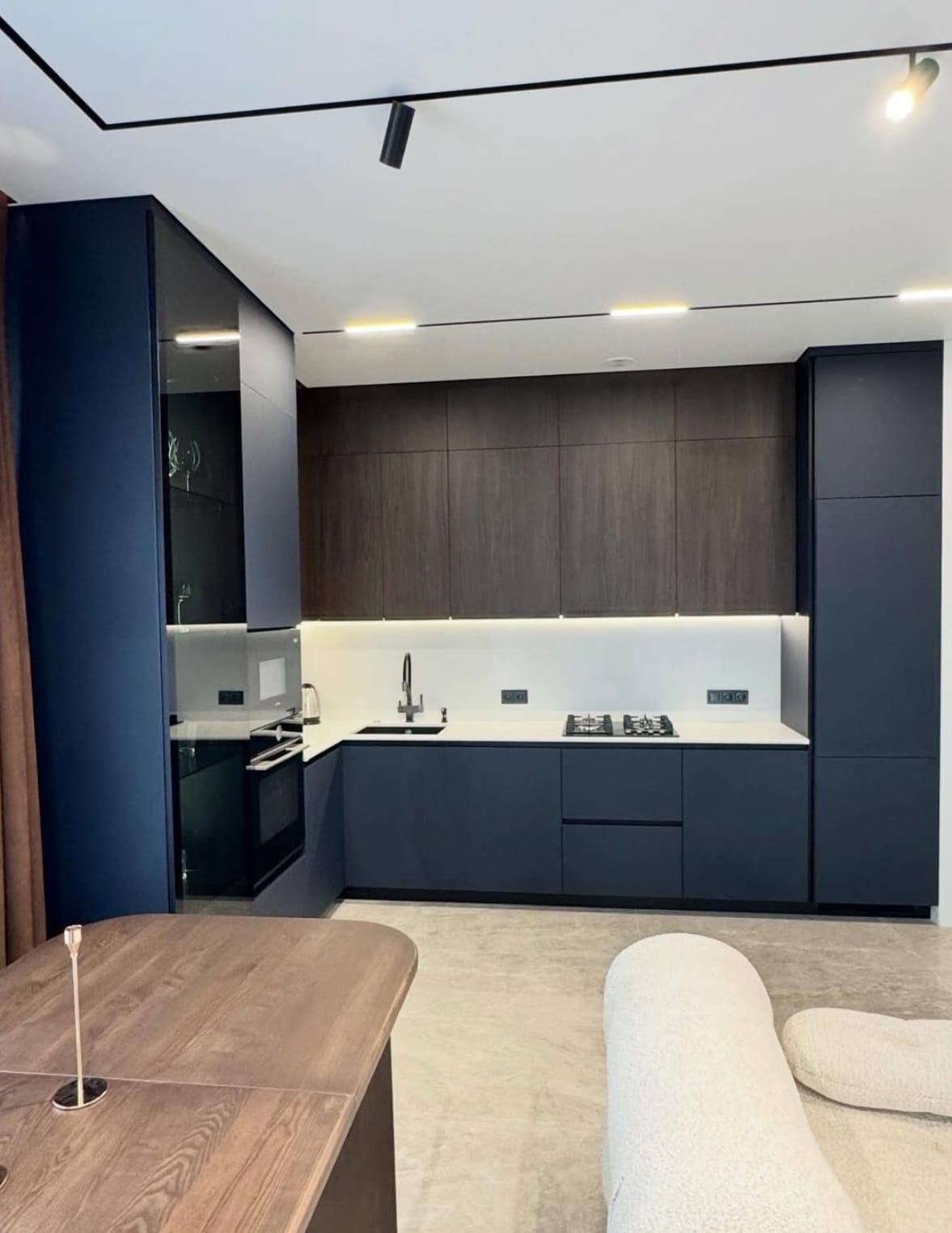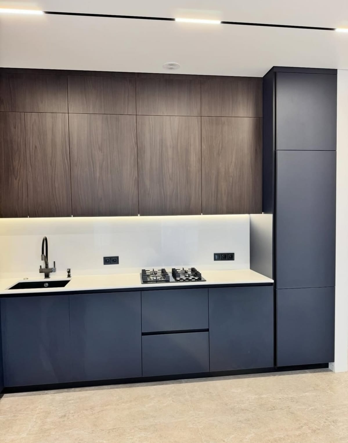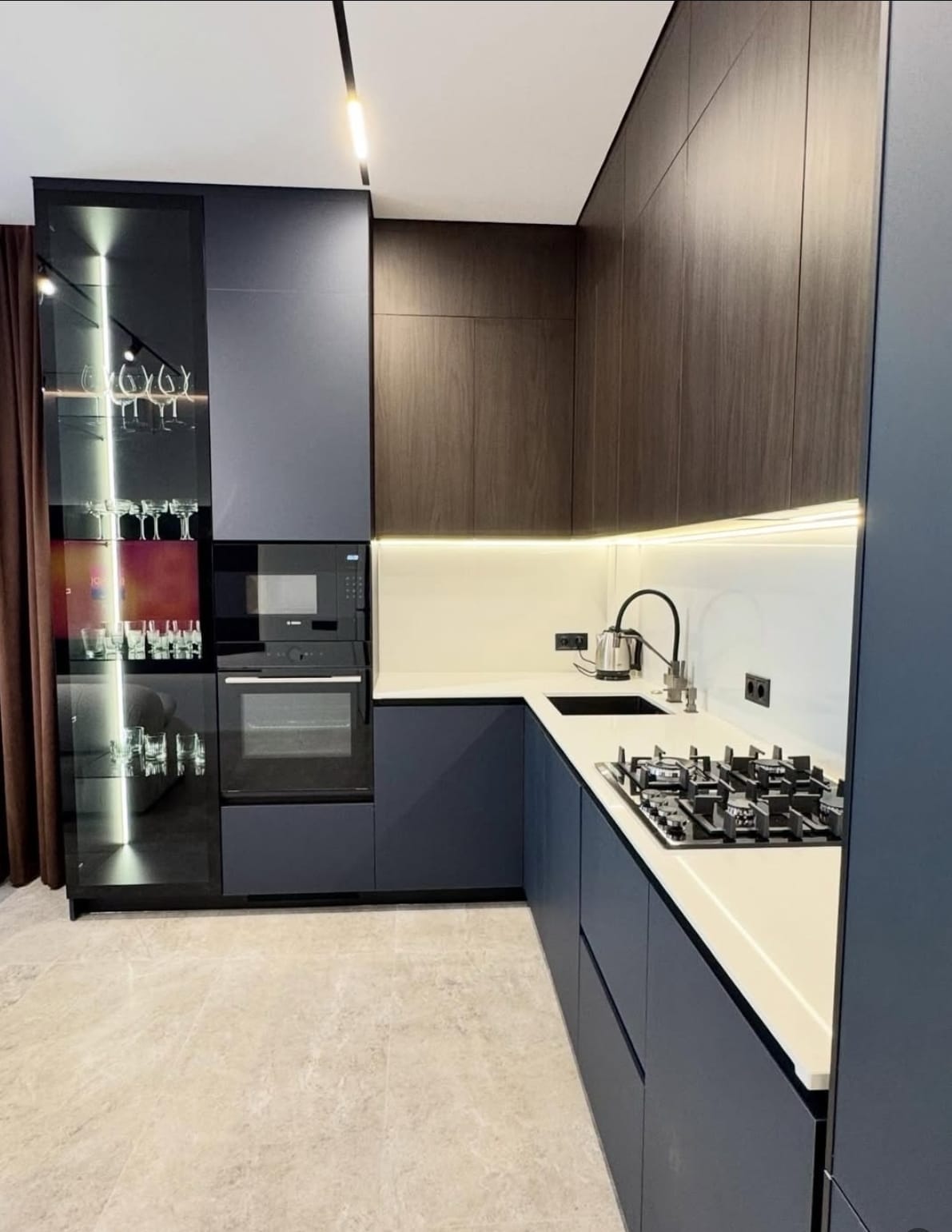 ქვედა კარადები შესრულებულია მუქი ლურჯი შეღებილი MDF-ისგან, ხოლო ზედა კარადები დამზადებულია დაშპონილი MDF მასალით, რაც ინტერიერს ბუნებრივ და დახვეწილ იერს აძლევს.სამუშაო ზედაპირი შესრულებულია თეთრი კვარცისგან, რომელიც გამოირჩევა მაღალი გამძლეობით, ჰიგიენურობითა და ელეგანტური ვიზუალით. სამზარეულოში ინტეგრირებულია ჩაშენებული ტექნიკა, რაც სივრცეს უფრო პრაქტიკულსა და მინიმალისტურს ხდის.