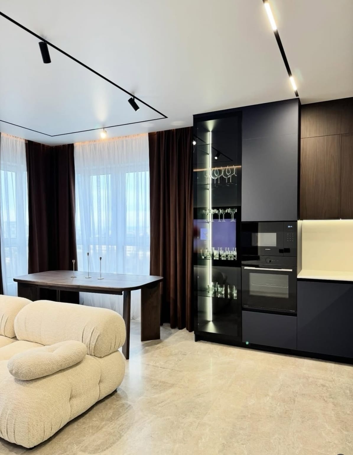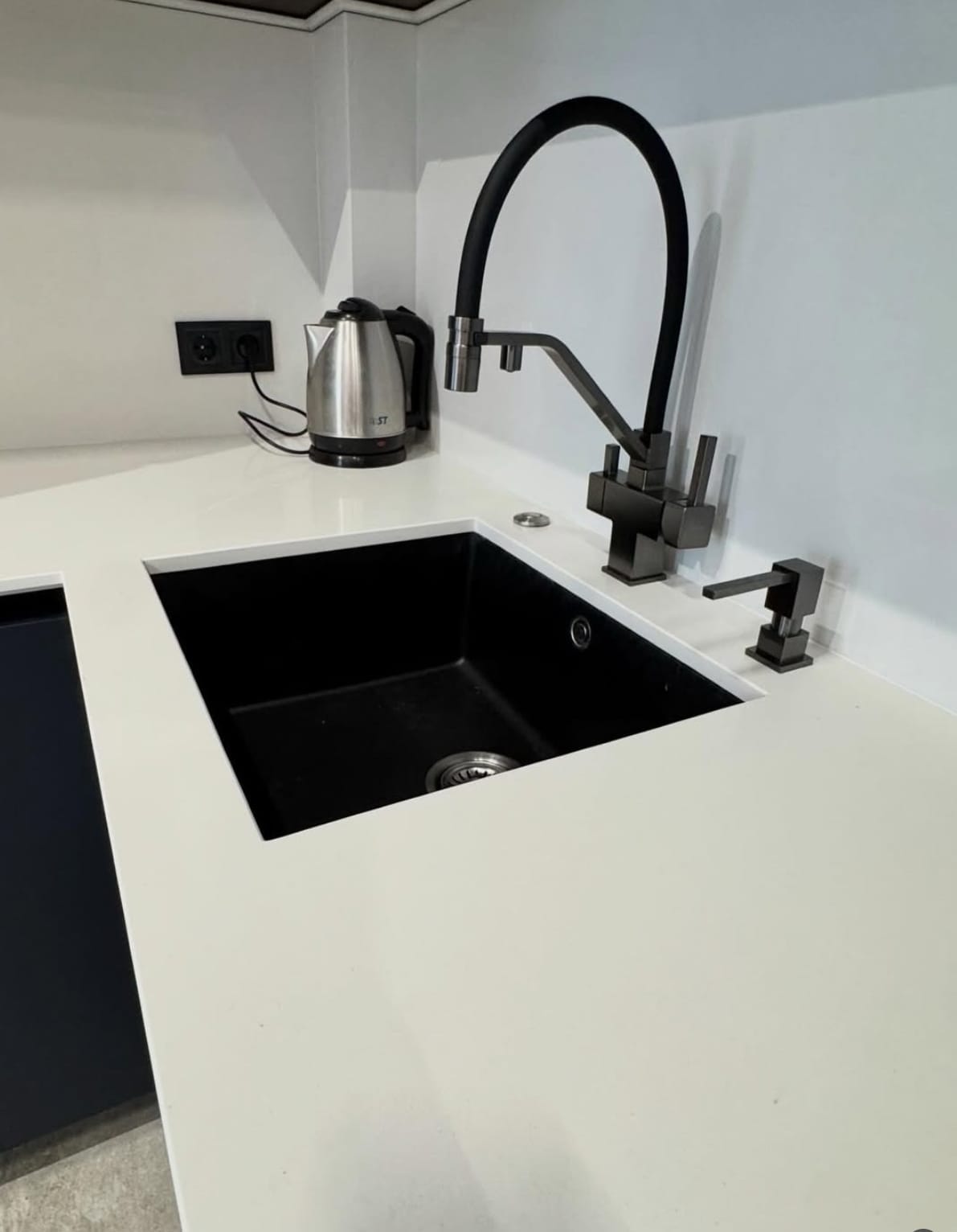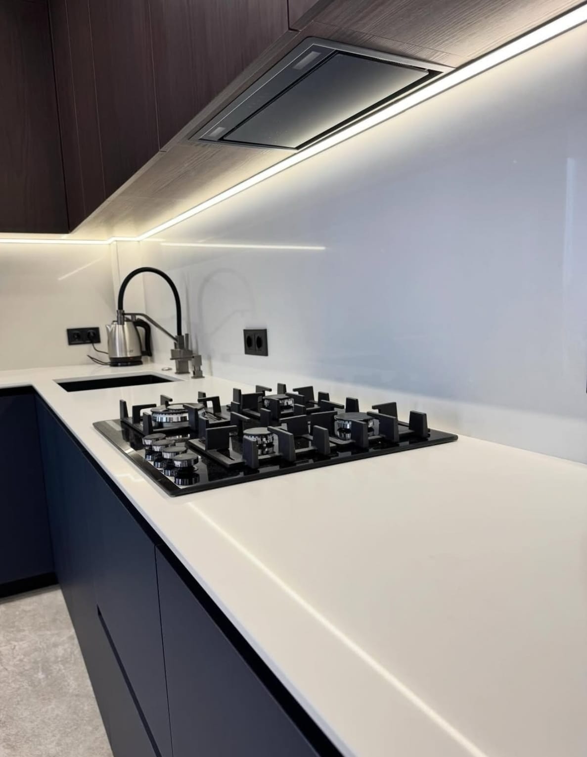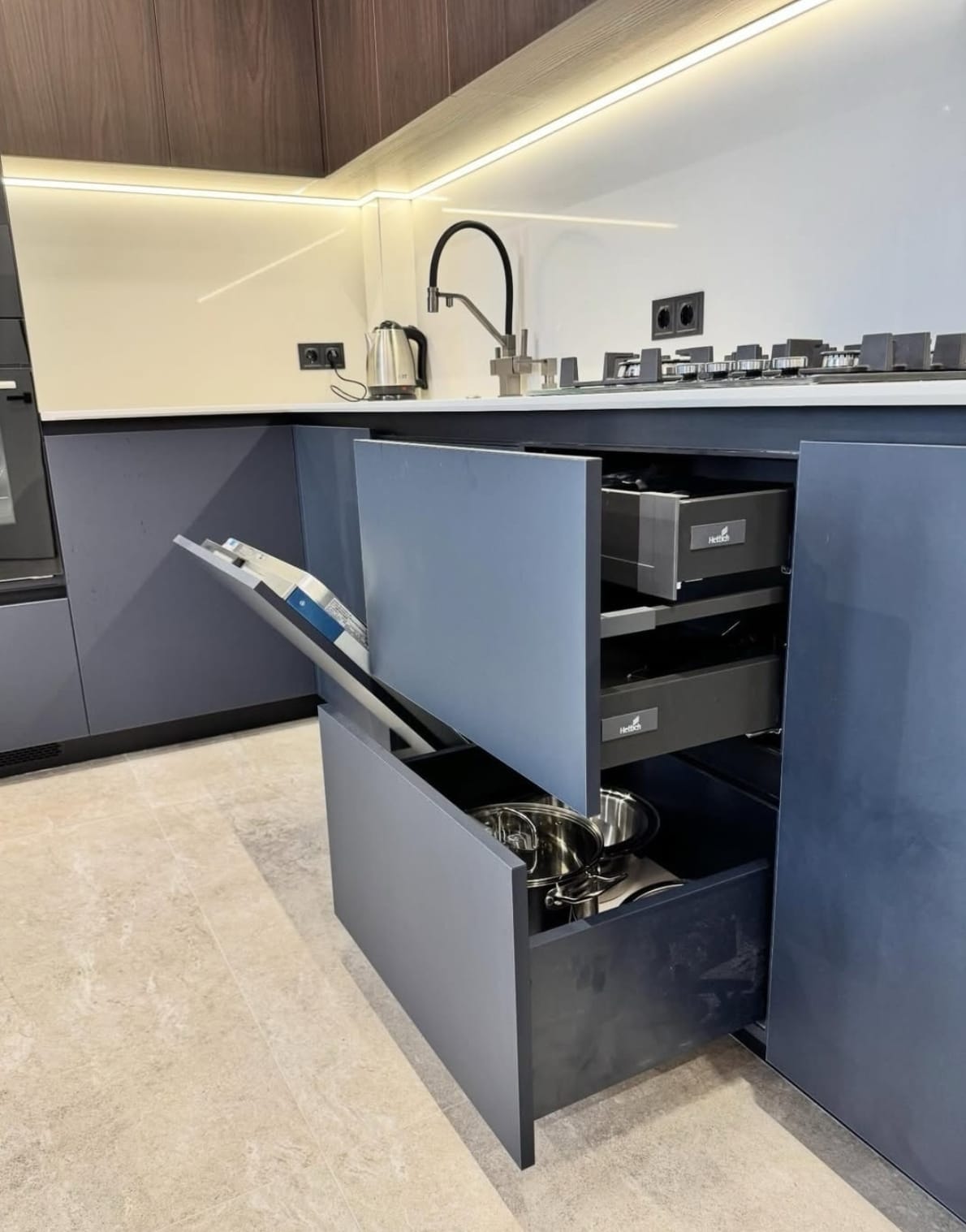 ქვედა კარადები შესრულებულია მუქი ლურჯი შეღებილი MDF-ისგან, ხოლო ზედა კარადები დამზადებულია დაშპონილი MDF მასალით, რაც ინტერიერს ბუნებრივ და დახვეწილ იერს აძლევს.სამუშაო ზედაპირი შესრულებულია თეთრი კვარცისგან, რომელიც გამოირჩევა მაღალი გამძლეობით, ჰიგიენურობითა და ელეგანტური ვიზუალით. სამზარეულოში ინტეგრირებულია ჩაშენებული ტექნიკა, რაც სივრცეს უფრო პრაქტიკულსა და მინიმალისტურს ხდის.