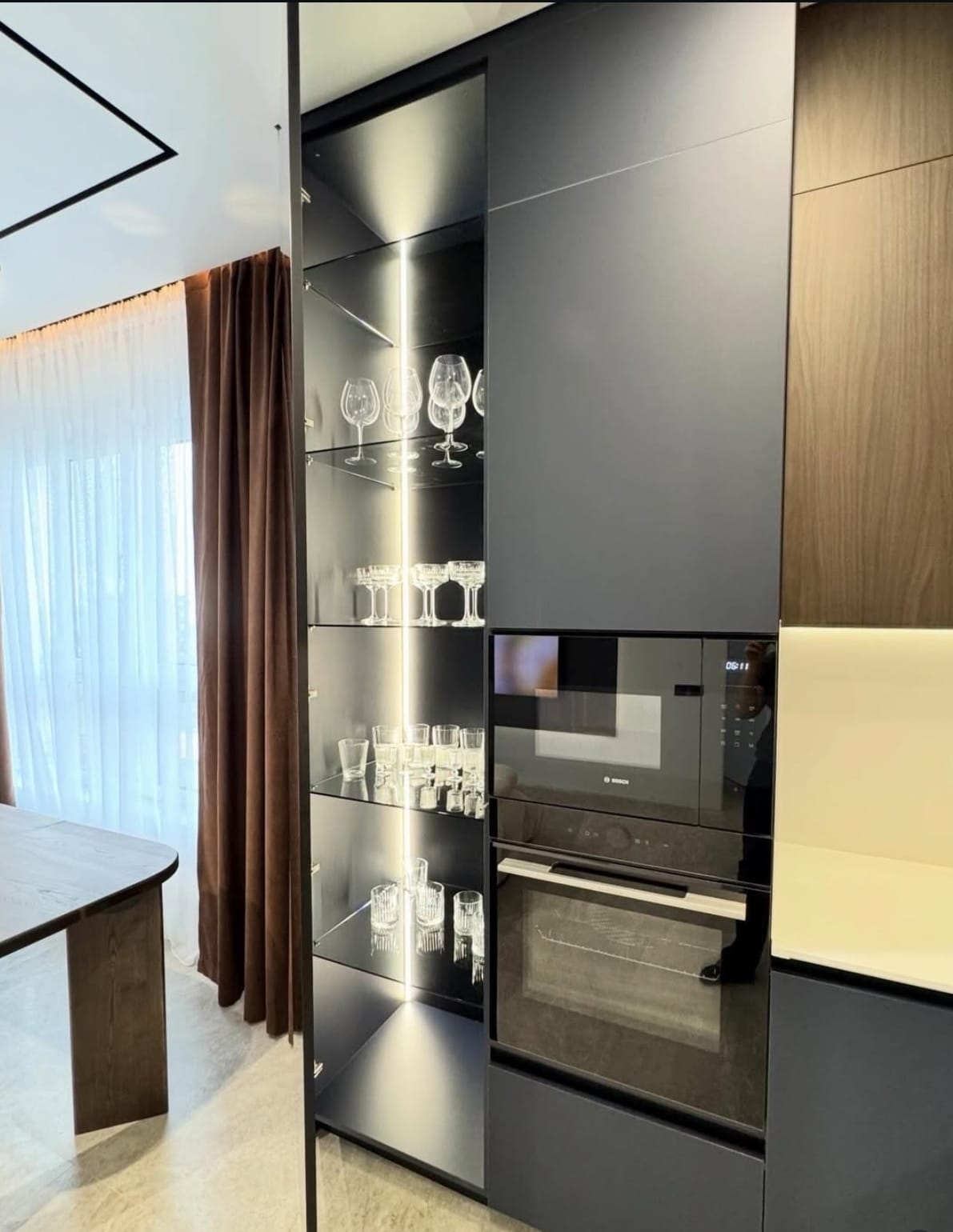 დამატებით, პროექტში გამოყენებულია მინის ვიტრინა, რომელიც სივრცეს სძენს ვიზუალურ სიმსუბუქეს და ფუნქციურ ელემენტს. ყველა მექანიზმი არის გერმანული Hettich, რაც უზრუნველყოფს ავეჯის ხანგრძლივობას და კომფორტულ გამოყენებას.