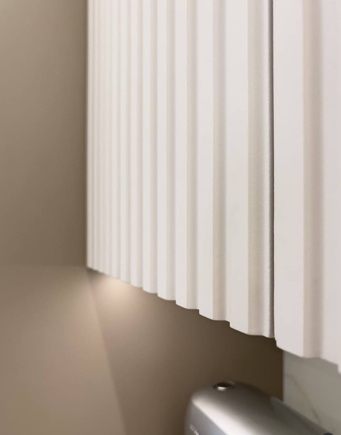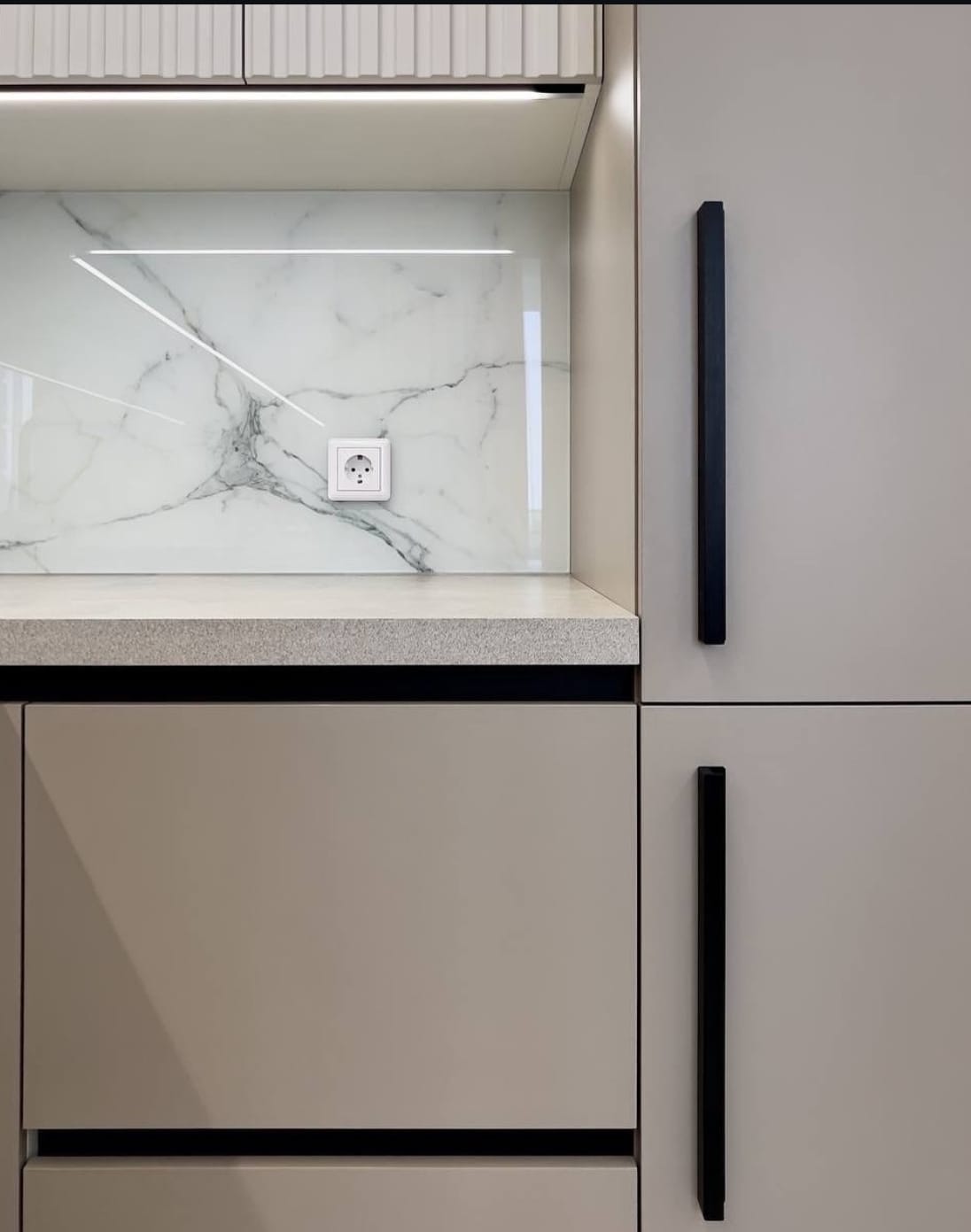 სამზარეულო პროექტი შექმნილია თანამედროვე ინტერიერისთვის, სადაც მთავარი აქცენტი გაკეთებულია პრაქტიკულობაზე და გამძლე მასალებზე. სამზარეულო დამზადებულია შეღებილი მდფ-ის მასალისგან, რაც ქმნის გლუვ ზედაპირს, პრემიუმ ვიზუალს და მარტივად ერგება როგორც მინიმალისტურ, ისე თანამედროვე საცხოვრებელ სივრცეებს.
