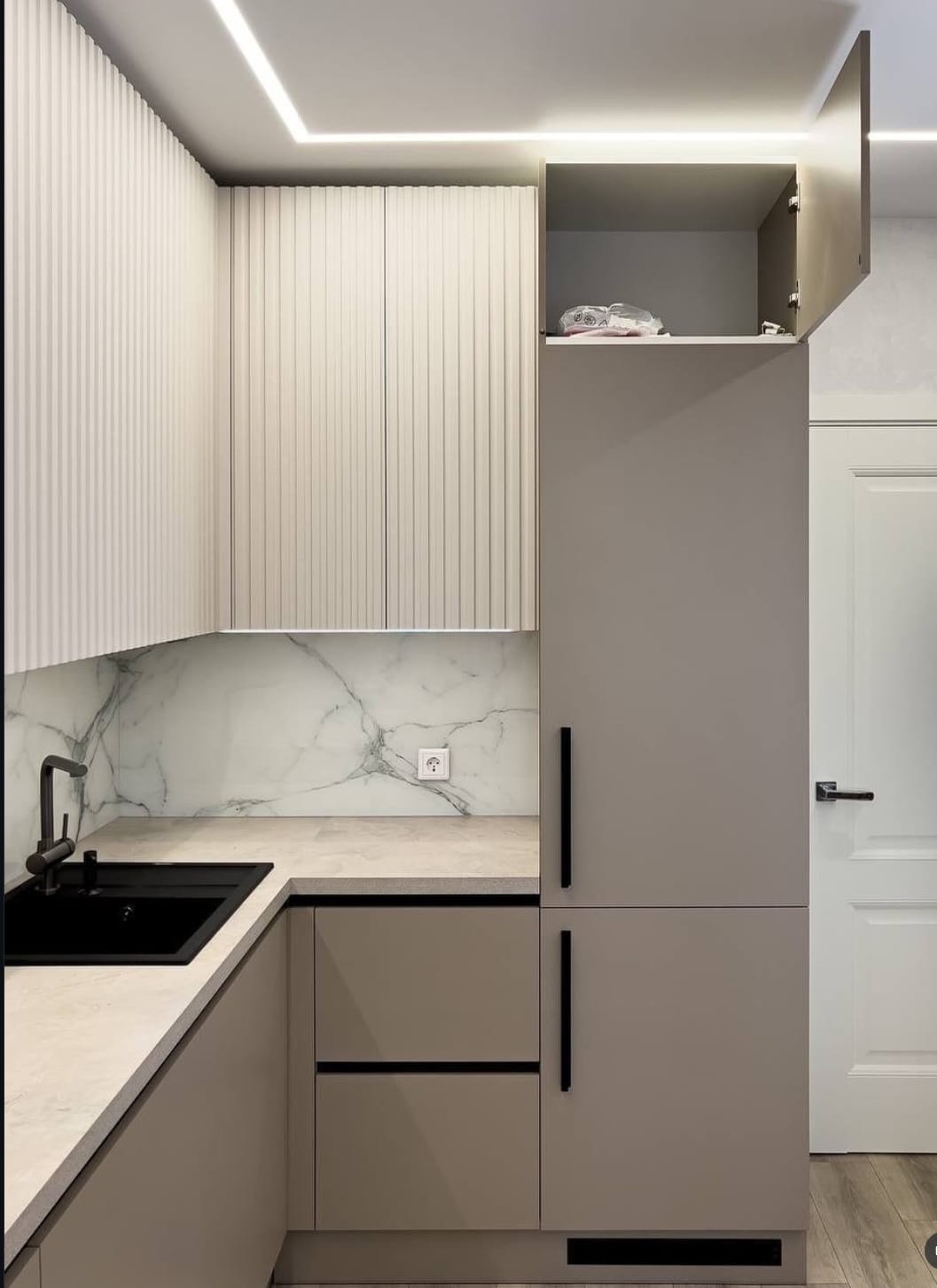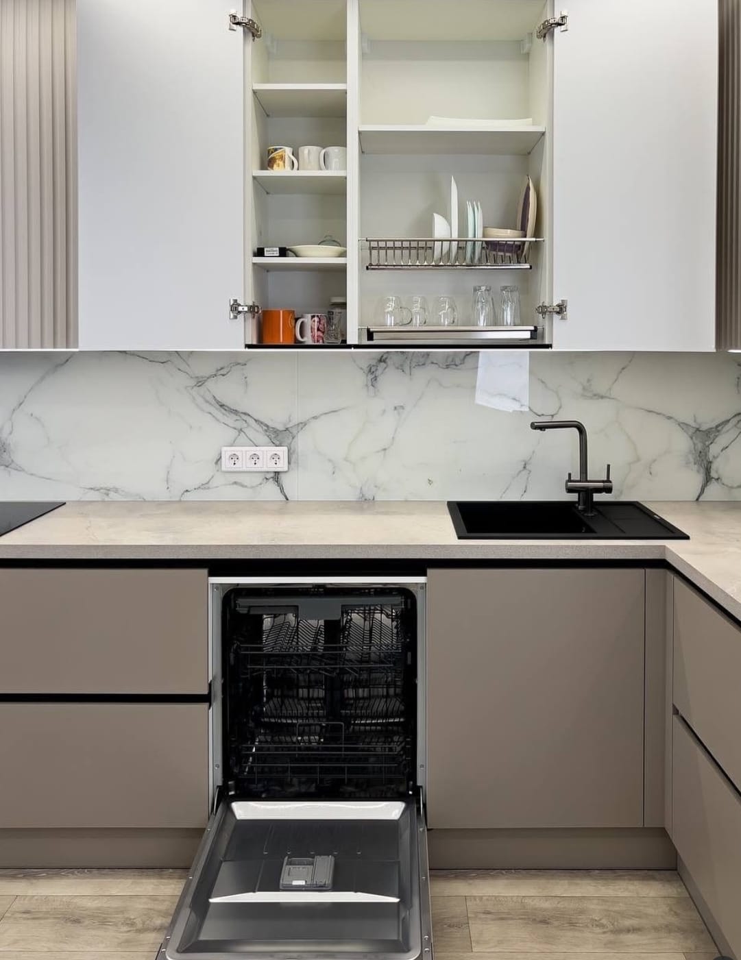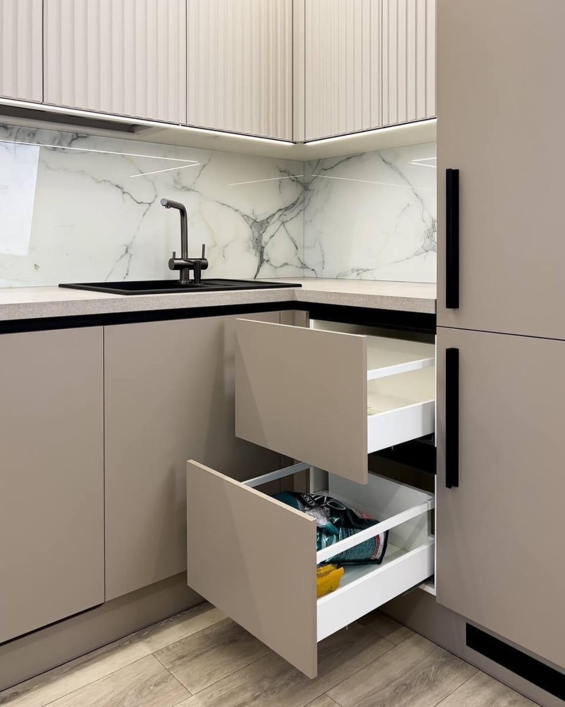 პროექტში ინტეგრირებულია ჩაშენებული ტექნიკა, რაც სამზარეულოს უფრო ორგანიზებულსა და ფუნქციურს ხდის. ყველა დეტალი გათვლილია ყოველდღიური კომფორტისთვის — ზედა და ქვედა კარადები, უჯრების სისტემები და LED განათება ერთიანად ქმნის სრულყოფილ სამუშაო გარემოს.