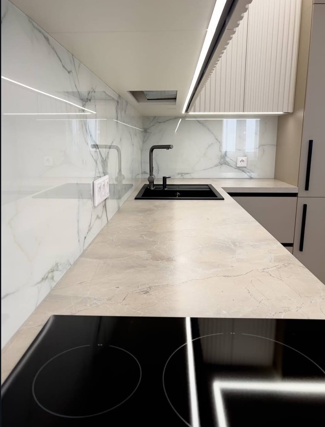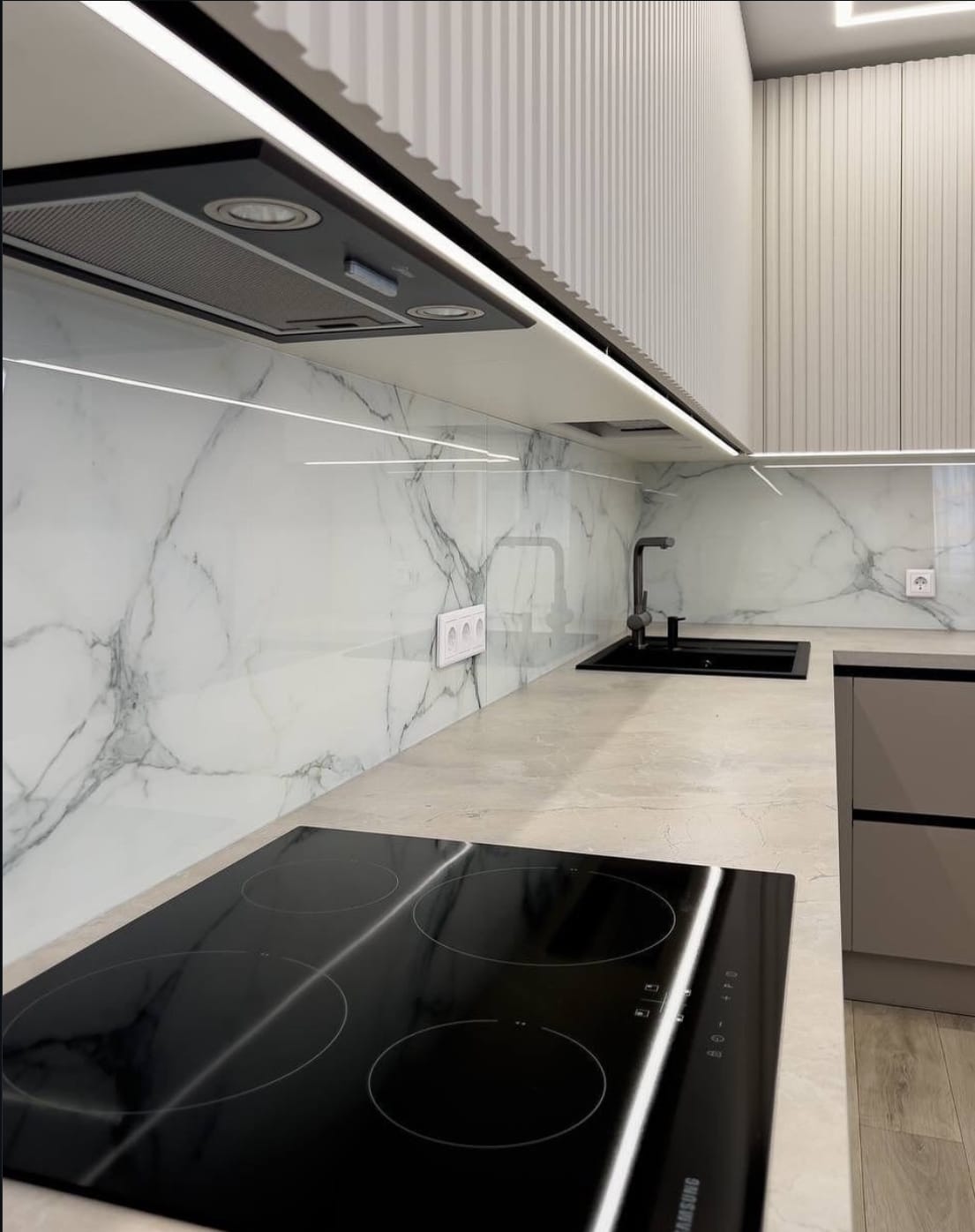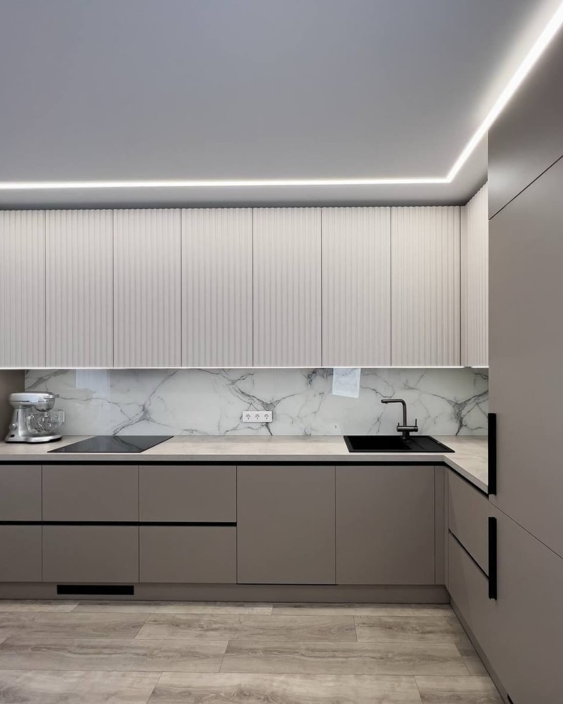 LED განათება დამატებით უსვამს ხაზს სამზარეულოს დიზაინს და ქმნის თბილ, თანამედროვე ატმოსფეროს, განსაკუთრებით საღამოს საათებში.