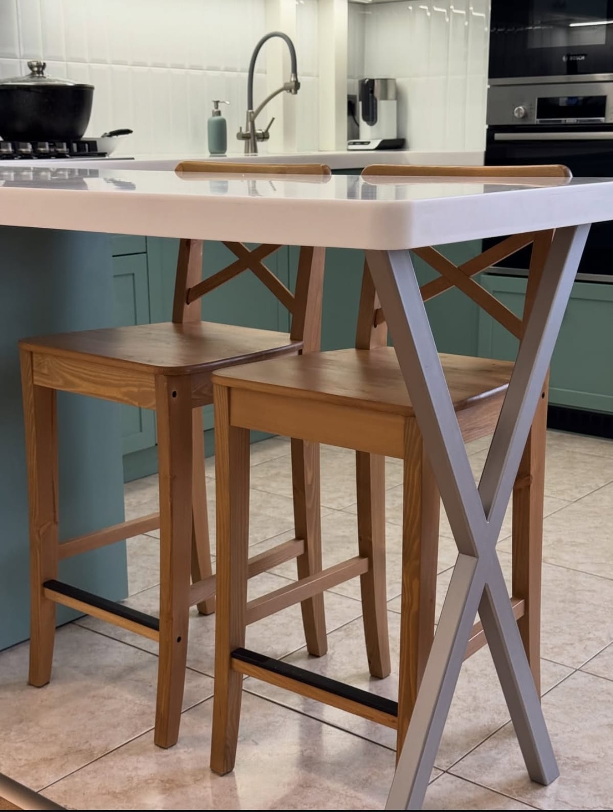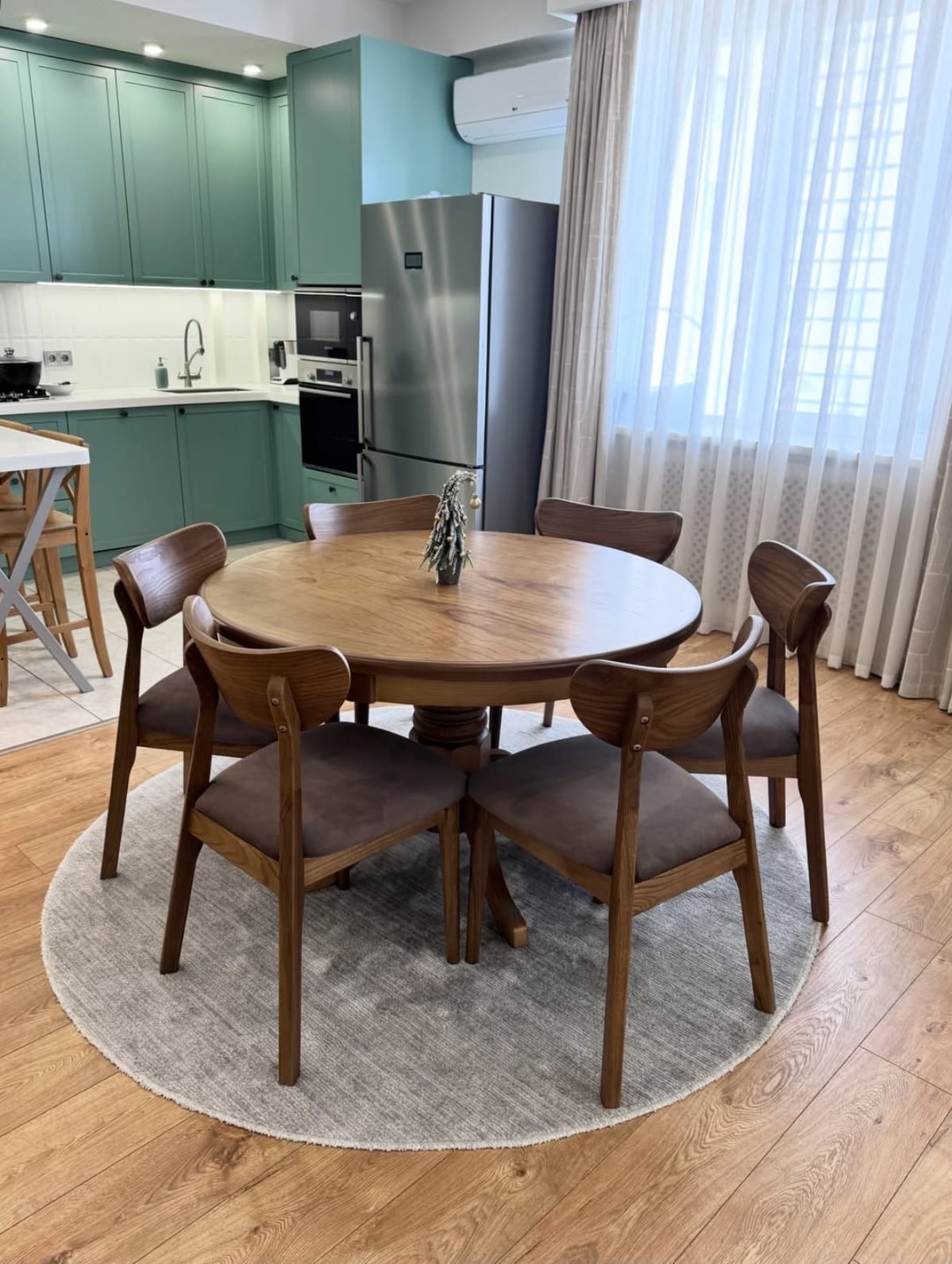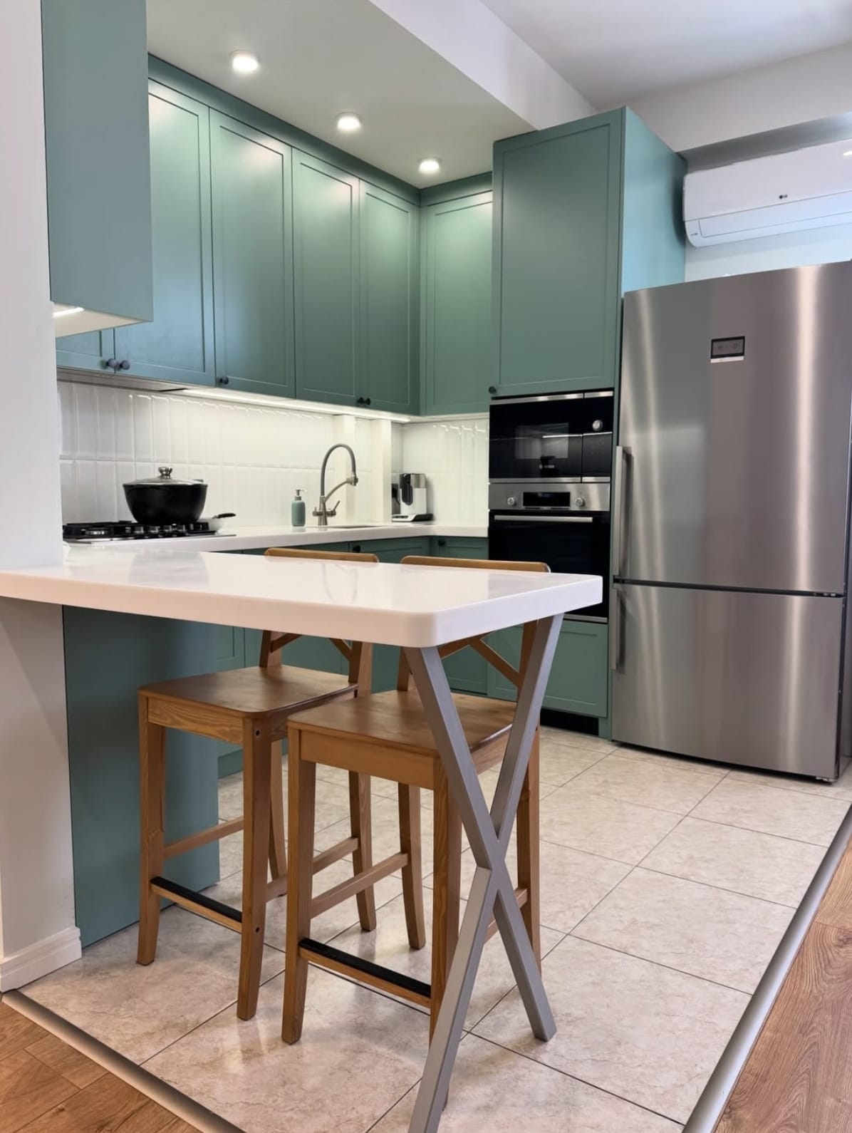 სამზარეულო არის U ფორმის განლაგებით და დამატებით ინტეგრირებული ბარის მაგიდით, რაც ქმნის პრაქტიკულ და კომფორტულ სივრცეს ყოველდღიური გამოყენებისთვის. სამუშაო ზედაპირი დამზადებულია თეთრი კვარცისგან, რომელიც გამოირჩევა გამძლეობით და მარტივი მოვლით.