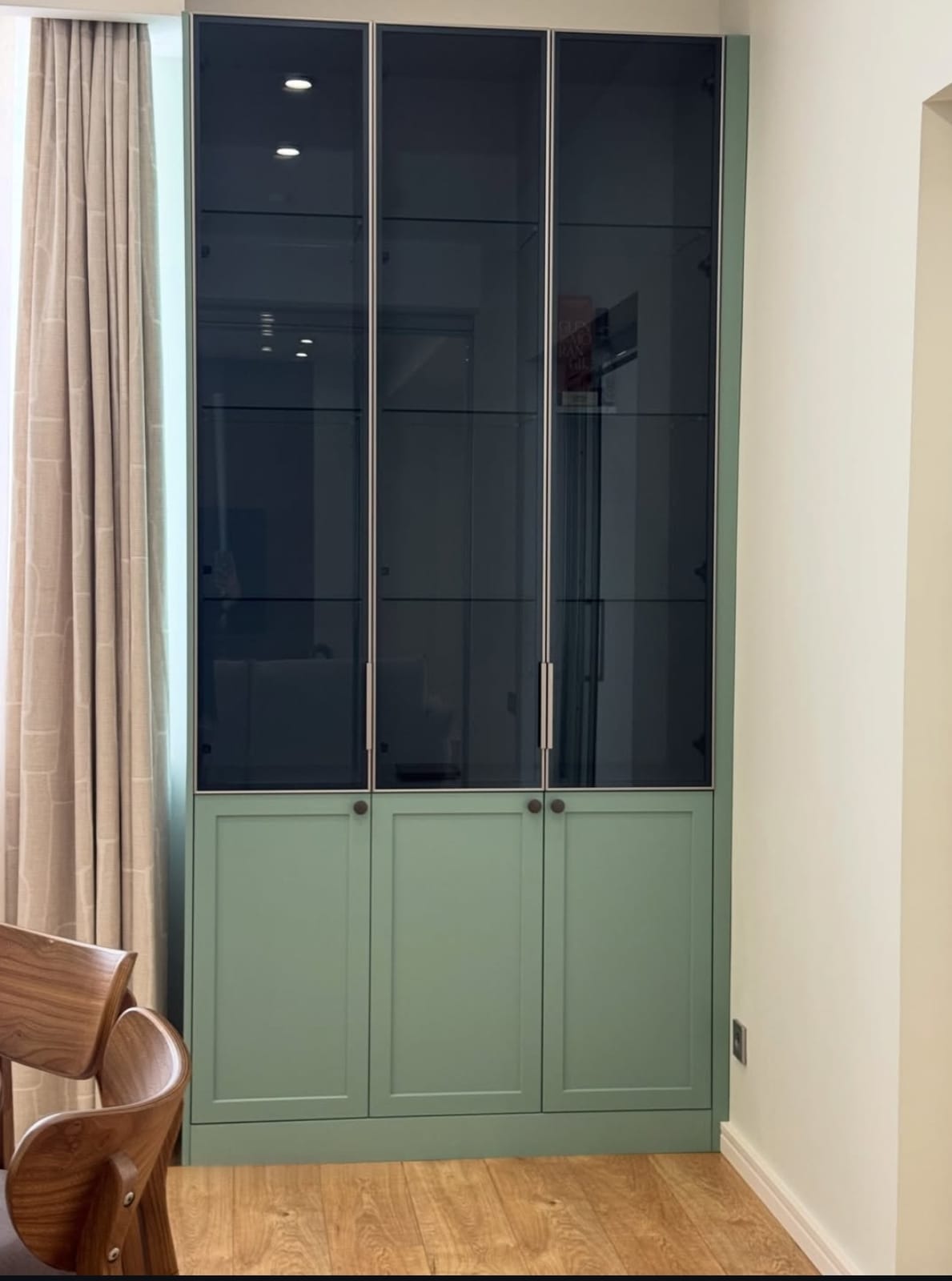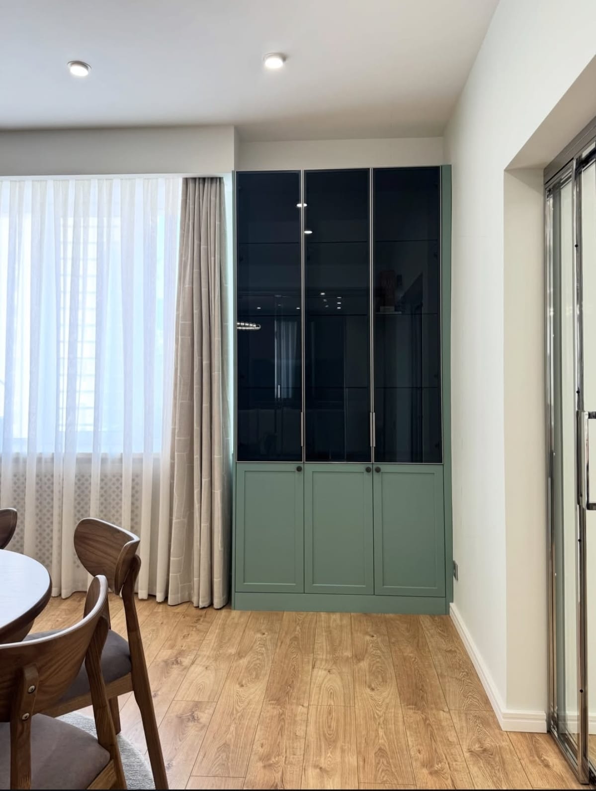 პროექტში გამოყენებულია ჩაშენებული ტექნიკა და მინის ვიტრინა, რაც ზრდის როგორც ფუნქციურობას, ასევე ვიზუალურ ეფექტს. მექანიზმები არის ავსტრიული Blum, რაც უზრუნველყოფს ავეჯის გამძლეობასა და კომფორტულ გამოყენებას.