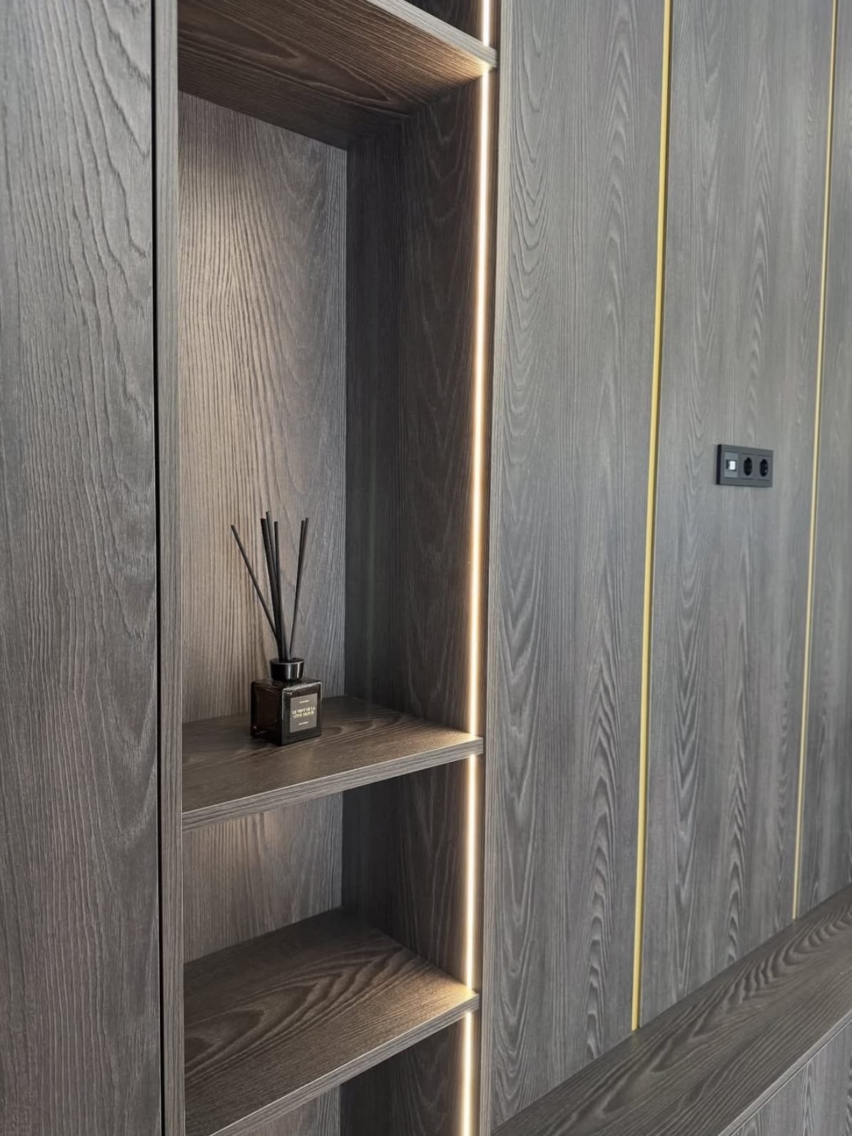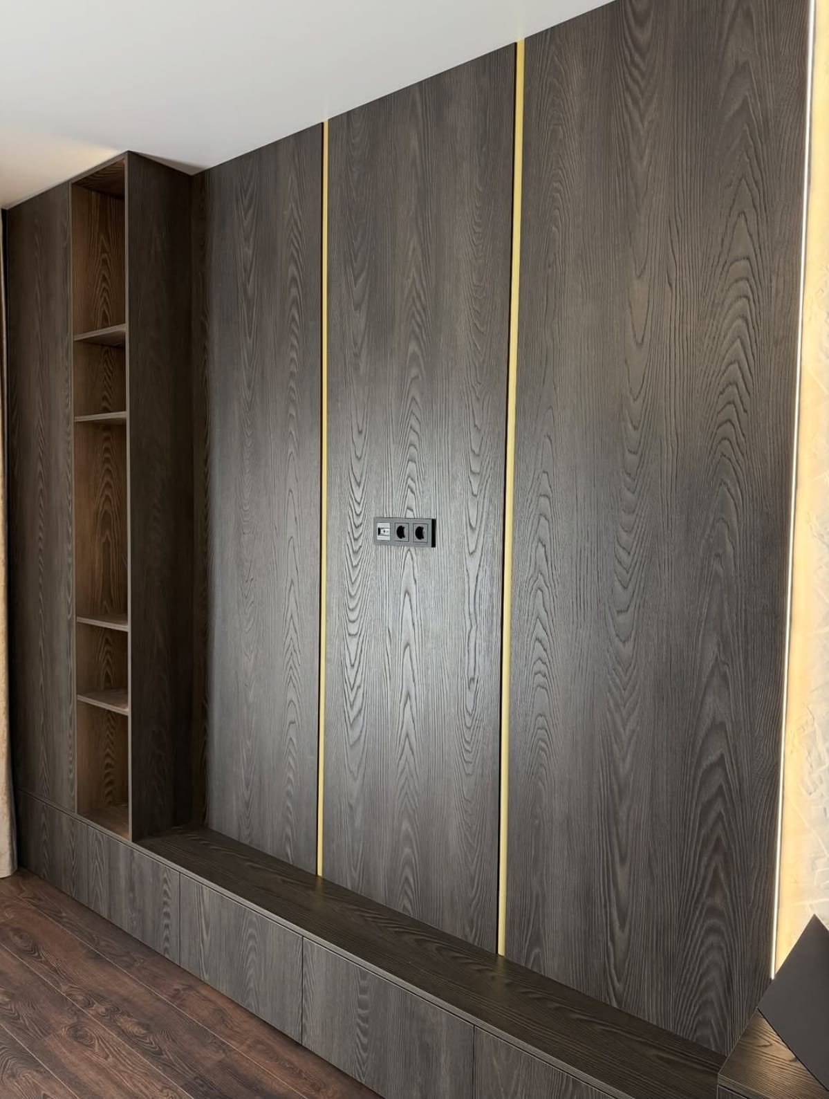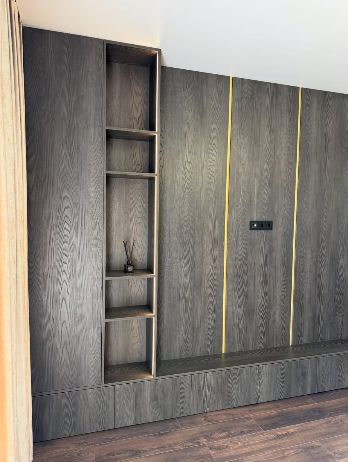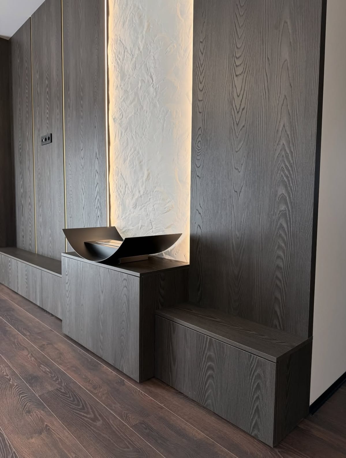 ინტერიერის ერთ-ერთ მთავარ ელემენტს, რომელიც აერთიანებს დიზაინსა და ფუნქციურობას. აღნიშნული მოდელი დამზადებულია დაშპონილი MDF მასალისგან, რაც ქმნის ბუნებრივ ტექსტურას და ელეგანტურ ვიზუალს. დიზაინში გამოყენებულია ღია და დახურული თაროების კომბინაცია, რაც საშუალებას გაძლევთ მარტივად მოაწყოთ როგორც დეკორატიული ნივთები, ასევე ყოველდღიური საჭიროების ნივთები. ეს გადაწყვეტა სივრცეს ხდის უფრო ორგანიზებულსა და პრაქტიკულს.